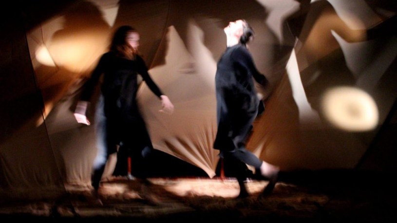 That the audience is allowed such deep access into Arikan’s personal insecurities is genuinely unsettling, and Memet Ali Alabora plays on that with his direction. Smith-Williams and Ogun move as one organism, pulsating like heartbeats or brainwaves along to John Rea’s similarly repetitive electronic compositions. Just as Arikan’s script is deliberately concise, so too does Alabora make sure that neither performer has any wasted motions. Each step has a purpose. Alabora’s design choices are also well thought-out. There’s something otherworldly about the way Angharad Evans’ lighting cascades through the fabrics that surround the set. Buddug James Jones’ box-like staging is a not-very-subtle analogy of Arikan’s brain, the playground for these eternally bonded characters.